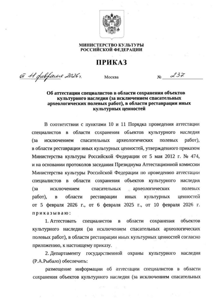 وەزارەتا کهلتووری يا رووسیا باوهرنامهيا پاراستنا شوونوارێن کهلتوورى بهخشى ئەندازيارهكێ کورد.