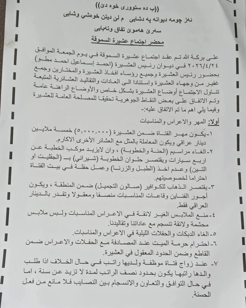هۆزا سمۆقیان ل قەزا شنگالێ چەند بڕیارێن نوو بۆ ڕێکخستنا ڕێوڕەسمێن داوەت و تازییان دەرکرن و کار دێ پێ ئێتە کرن.