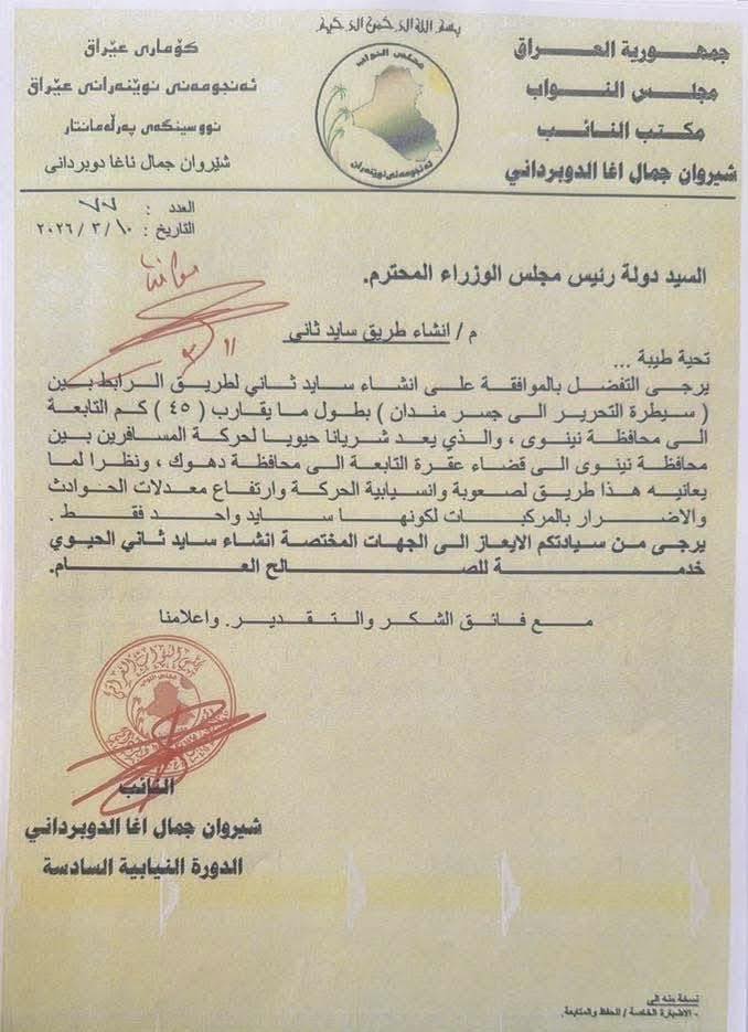 أعلن النائب شيروان الدوبرداني عن استحصال الموافقة الرسمية من رئيس مجلس الوزراء لإنشاء ممر ثانٍ (سايد ثاني) لطريق “سيطرة التحرير – جسر مندان” التابع لناحية بعشيقة، بطول يقارب 45 كم.